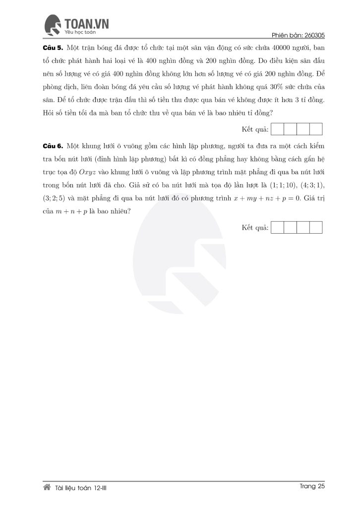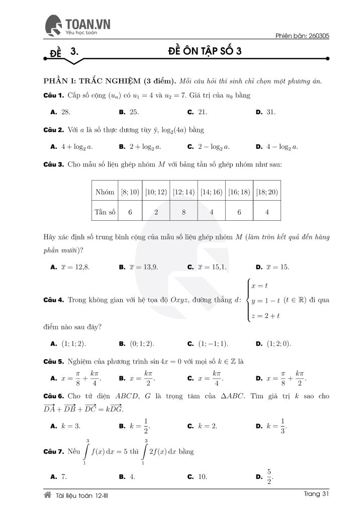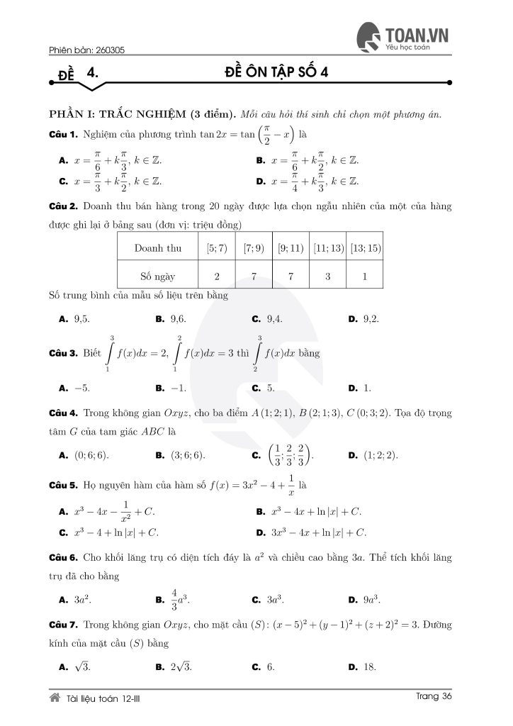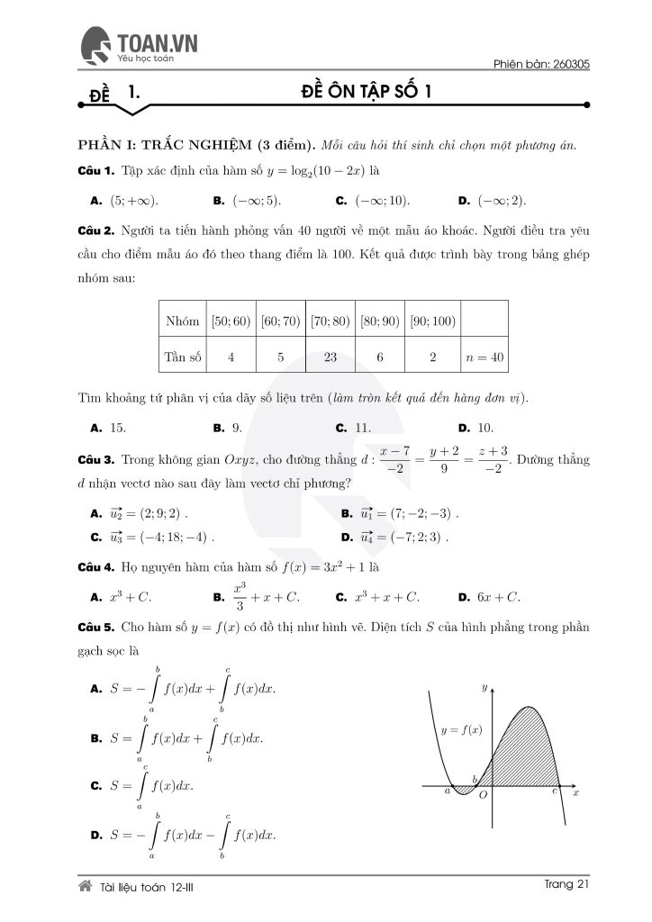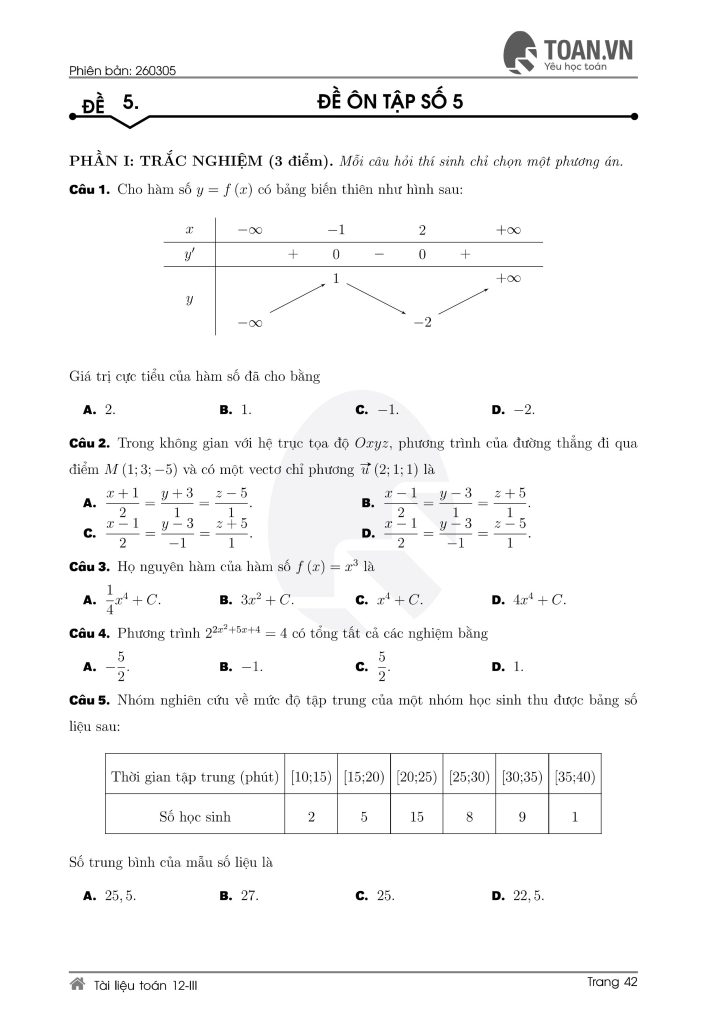 Tổng hợp 5 đề ôn thi Toán lớp 12 mới nhất